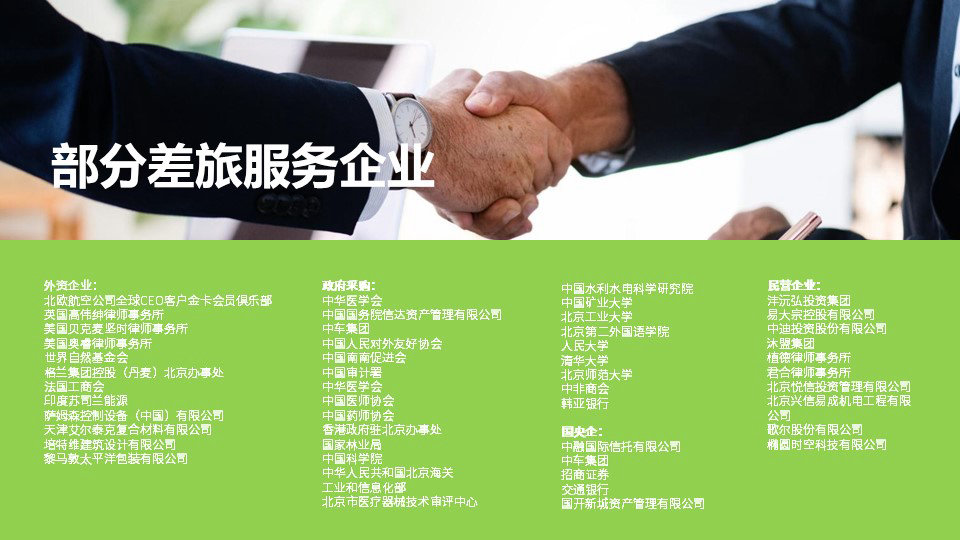北京泓然商務旅行服務有限公司隸屬于“泓然商旅”;“泓然商旅”成立于2007年,十余年來深耕于企業差旅服務(TMC),旗下擁有“北京泓然商務旅行服務有限公司”、“北京騰邦泓然國際旅行社有限公司”兩家實體企業,具有超過100家中外航空公司核心機票代理授權和國內游、入境游、出境游、會議的經營許可?!般簧搪谩币殉蔀閲H航空運輸協會IATA的正式會員、中國政府采購指定服務商和中國南南促進會會員,并多次榮獲航空公司授予的各類獎項。我們的業務范圍包括:國內國際機票、酒店預訂、會議服務、公商務考察、企業團建、高端定制旅行、代辦簽證等,在境內外主要旅行目的地擁有完善的接待網絡。?